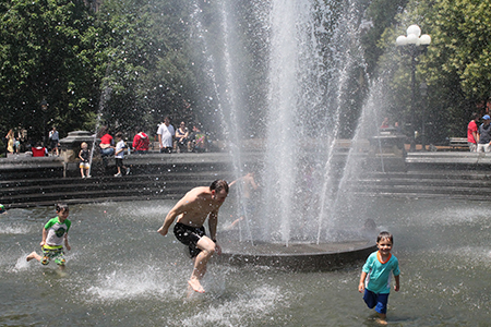マンハッタン区のワシントン・スクエア・パーク。19日、子ども連れなど多くの人が噴水に入ったり、日陰で寝そべったりしていた。市は公共プールも開放している。NWSが150年にわたる統計で算出した、7月下旬の市の「通常気温」は華氏84.1度(摂氏29度)。7月20日の観測史上最高は1977年の華氏104度(摂氏40度)=19日午後撮影(photo: Yurika Fukagawa / 本紙)