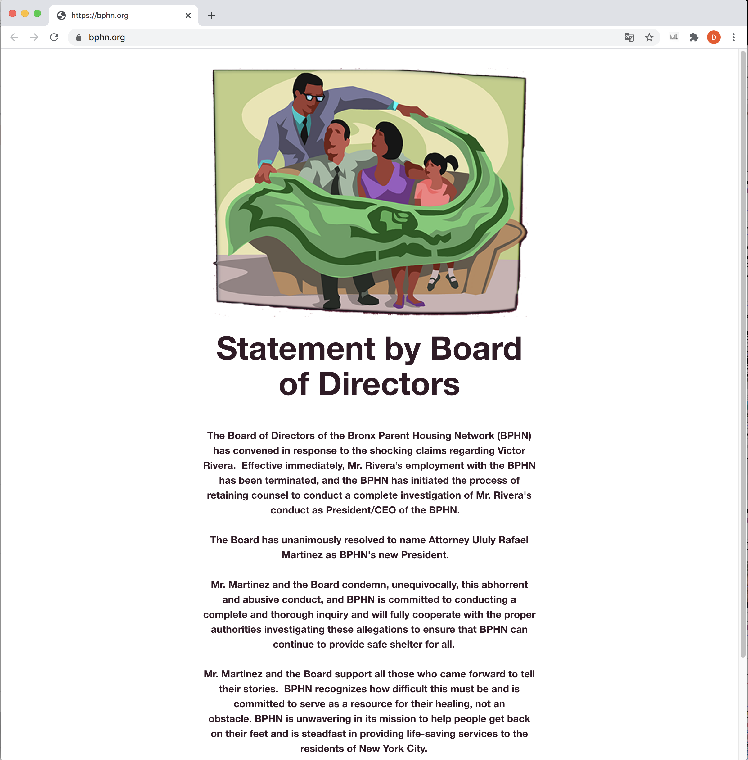 市内でホームレスシェルターを運営するブロンクス・ペアレント・ハウジング・ネットワークの取締役会は同日、責任者のビクター・リベラ氏(60)を解雇した。セクハラと職権乱用の疑いがあり、ブロンクス区の検事当局も捜査を開始した。8日ニューヨークタイムズが報じた。