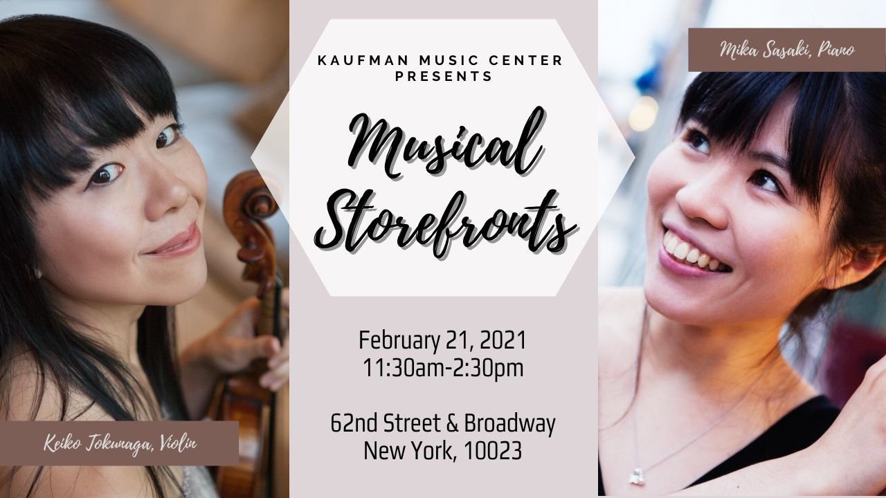 コロナ禍により演奏の機会を失った音楽家たちをサポートすべく、Kaufman Music CenterとAlphadyne Foundationが協力して設立したMusical Storefronts。邦人ヴァイオリニストとして初のグラミー賞を受賞したNY在住の演奏家、徳永慶子が11:30〜14:30の間、ピアニストの佐々木美歌とともに古典からガーシュウィン、ピアソラまで幅広いレパートリーのプログラムを演奏する。リンカーンセンター付近、62丁目とブロードウェイの一角をコンサート会場に改造し、屋内で演奏するアーティストたちをガラス越しに鑑賞できる。