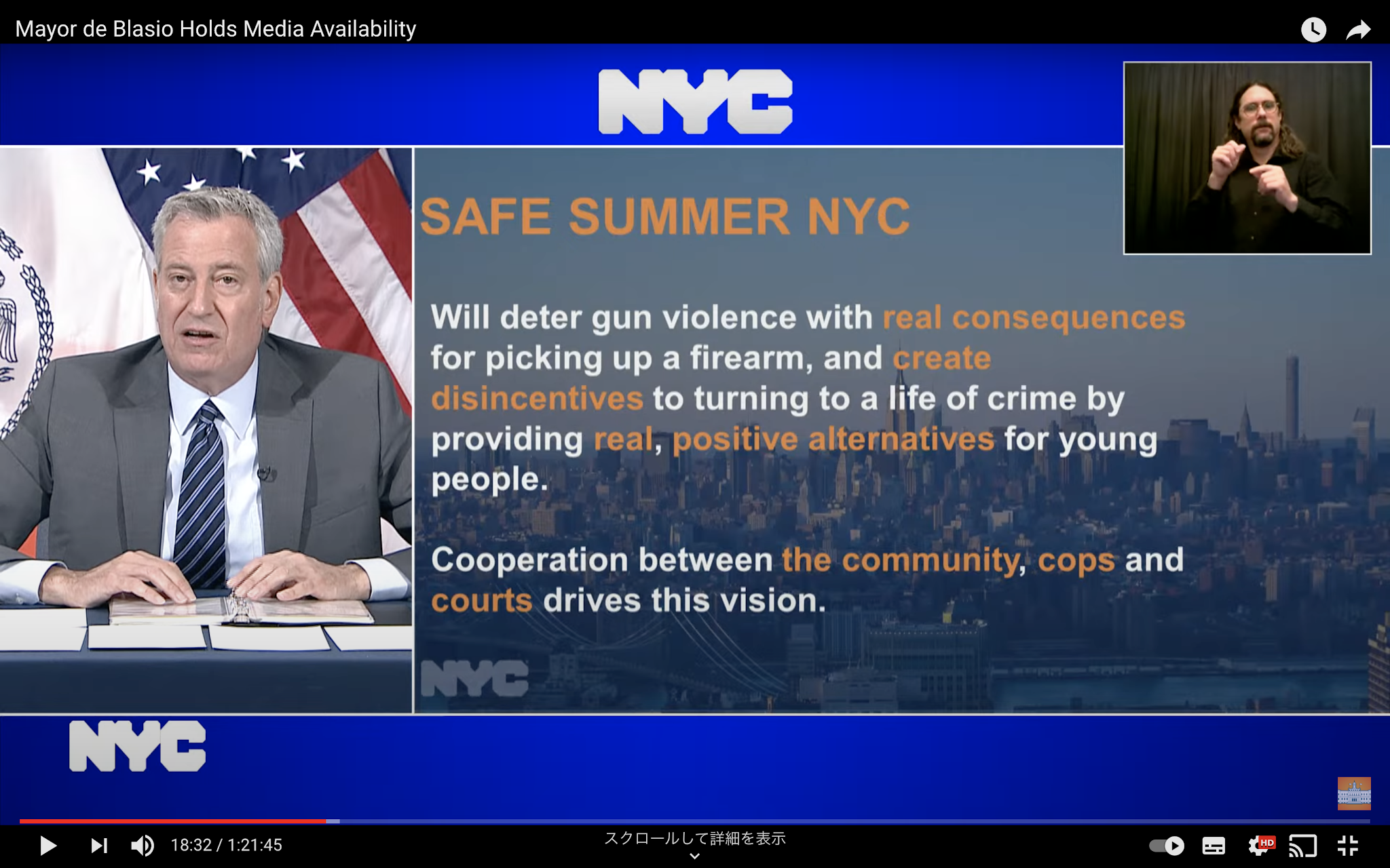 ニューヨーク市のデブラシオ市長は20日、増加する銃犯罪の対応策を発表した。この対応策は「セーフ・サマーNYC」と名付けられ、コミュニティーへの資源投入、警官の再配備、対面による裁判の再開を盛り込んでいる。同日、ウォール・ストリート・ジャーナルが報じた。