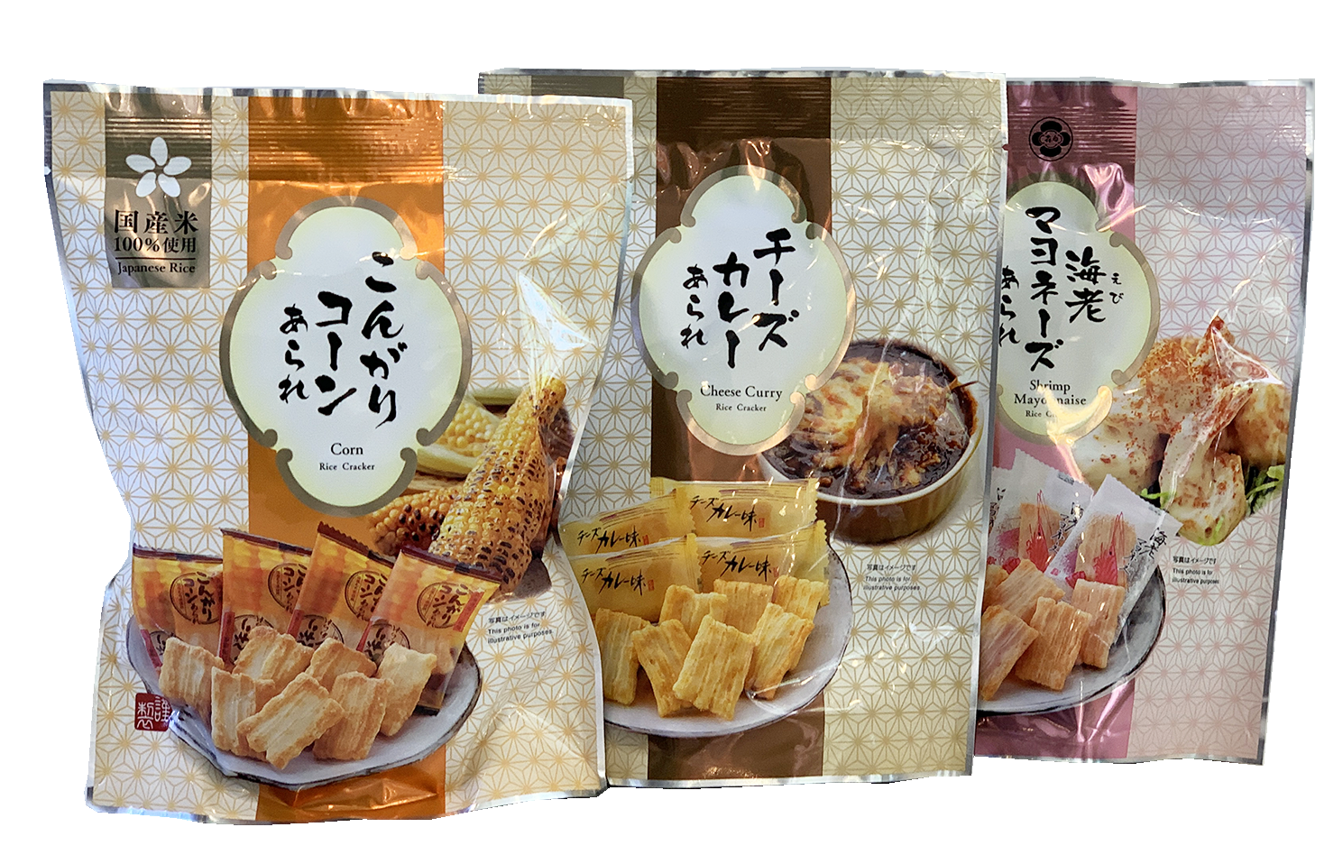 森白製菓の「変わりあられ」シリーズ。チーズカレーは、カレーの刺激とまろやかなチーズが絶妙。こんがりコーンはとうもろこしの粉末を100%使った、こんがり醤油味。海老マヨネーズは、国産餅米と国産海老で香ばしく焼き上げ、マヨネーズでバランスよく酸味を加えたおつまみにも合う味に仕上がっている。
