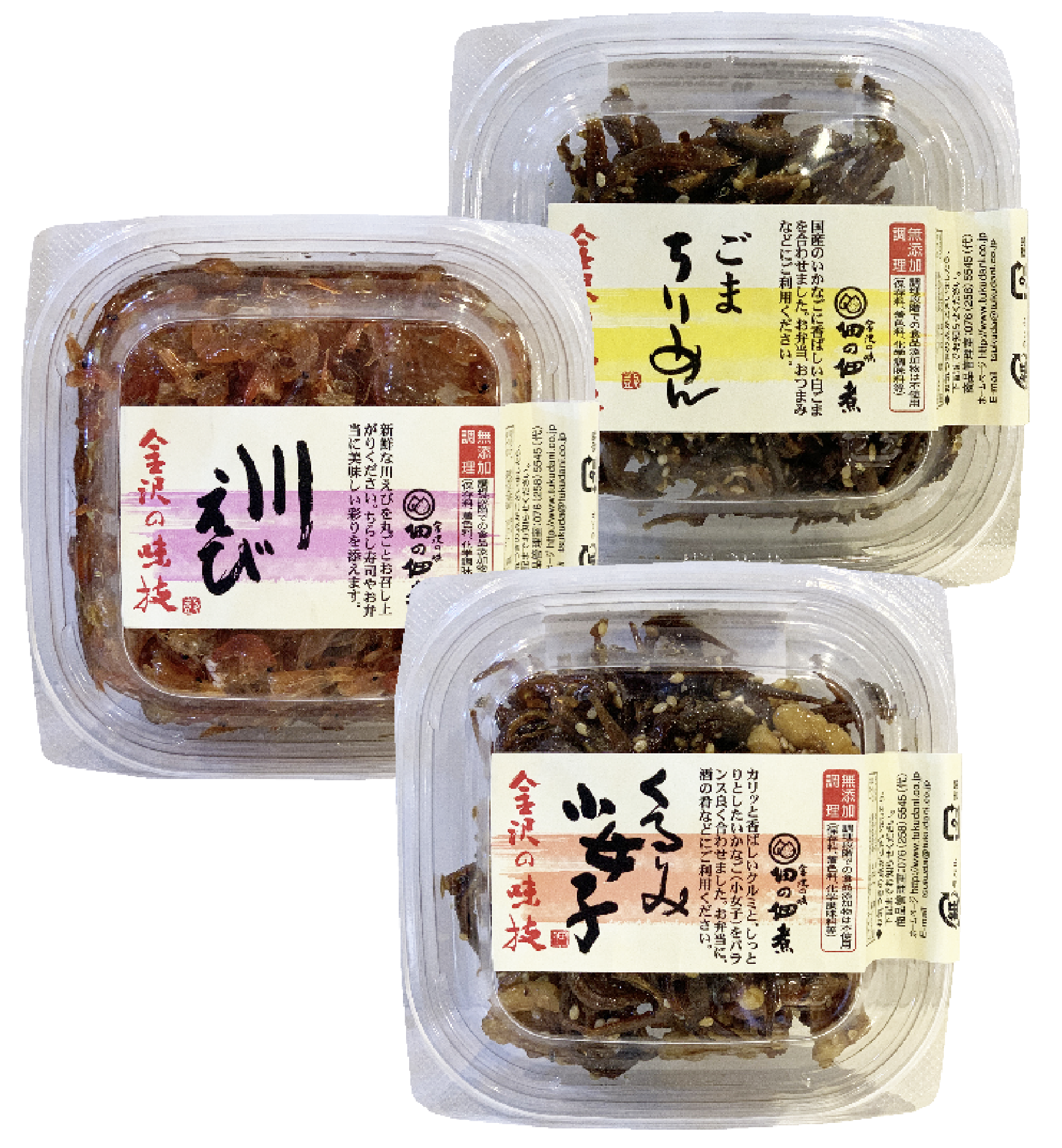 ごり、くるみ、加賀の産物を佃煮に独自の味を創った金沢の佃煮。国産のいかなごに香ばしい白ごまを合わせた「ごまちりめん」、カリッと香ばしいくるみと、旨みたっぷりのいかなごを合わせた「くるみ小少女(いかなご)」、鮮度の良さを大切にし、醤油を使わずに甘みをポイントに炊き上げた「川えび」を揃える。