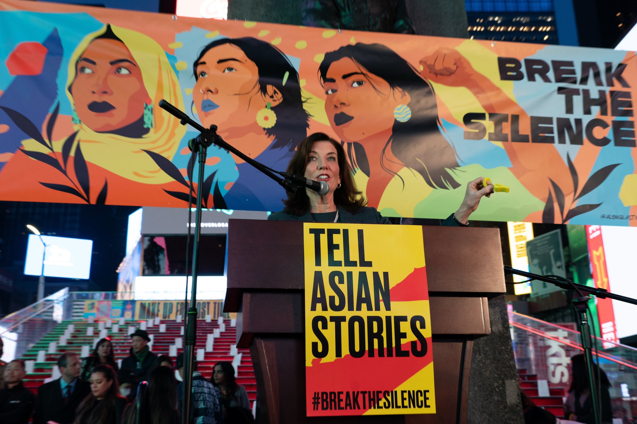 この日は、ジョージア州アトランタ市内のスパで8人が銃殺されてから1年目に当たる。被害者のうち6人はアジア系の女性だった。ニューヨーク市内でのアジア系住民に対する犯罪は2021年、133件と史上最多を記録した。最近もヨンカーズにあるビルのロビーで、67歳のアジア系女性が125回以上も殴られたり蹴られたりするという事件が発生。容疑者はヘイトクライムの疑いで逮捕された。抗議集会に出席したホークル知事は「アジア系住民へのヘイトを撲滅する」と宣言。「その動きは、今この地から始まる」と強調した。