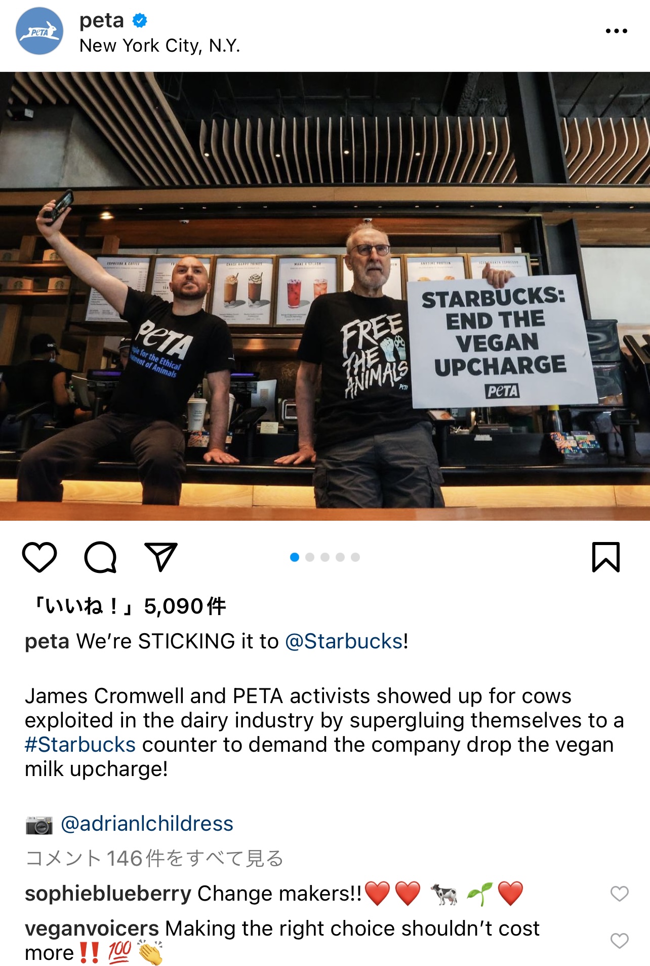 PETAは以前からこの問題への抗議を続けており、最近はビートルズの元メンバー、ポール・マッカートニーに対し、米国の店舗も英国と同様に追加料金の撤廃を求める、スタバの前CEOに対する公開書簡を書いてもらった。