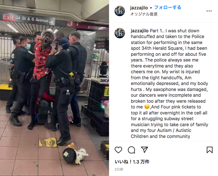 ニューヨーク地下鉄の駅構内で5年間にわたり、サックスを演奏してきた有名ミュージシャンが23日夜、5人の警察官に取り囲まれた後、身柄を拘束された。逮捕時の動画はSNSで拡散され、話題を呼んでいる。amニューヨークが伝えた。
