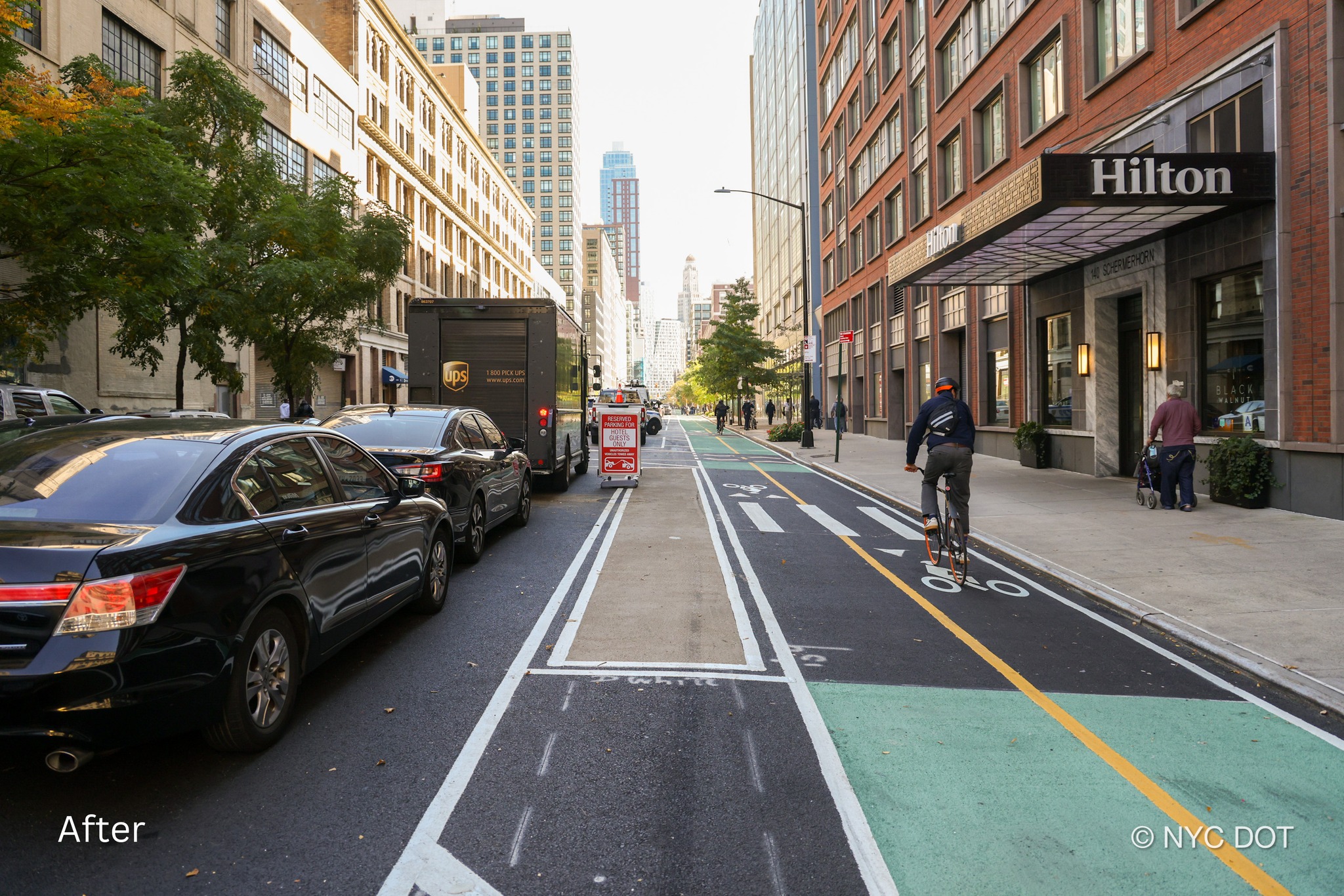 ニューヨーク市交通局(DOT)は、今回の保護自転車レーン新設にあたり、このエリアでの歩行者通路と一方通行の車両通行を巡り、注意を呼びかけている。DOTによれば、この自転車専用レーンは「シェアド・ストリート」と名付けられた大きな計画の一部。歩行者と自転車利用者の双方が安全だと感じながら、自動車が「歩行者中心のビジネス街」に出入りし、通行できることを期待している。