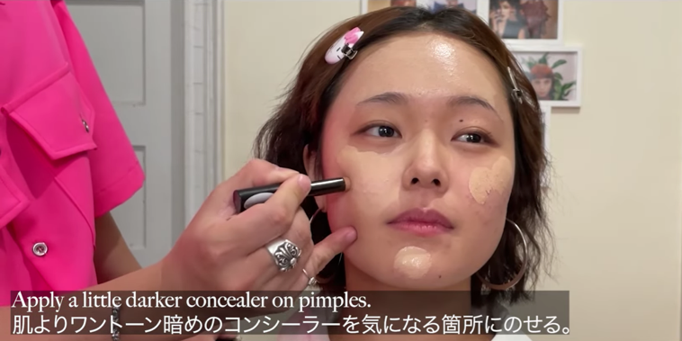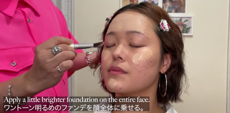 ・ワントーン明るめのファンデを顔全体に乗せる。おでこ、頰、あごなど4点にのせたら、それ以上のファンデーションは追加しないこと。(塗りすぎに注意!)