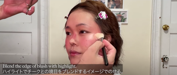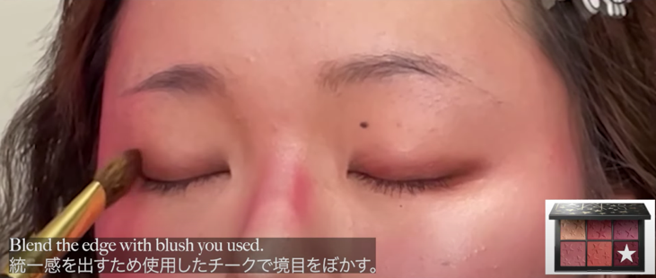 ・アイシャドウをブラシでブレンドし、統一感を出すため③で使用したチークで境目をぼかす。