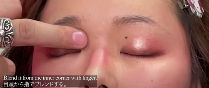 ・下まぶた目尻から明るめのピンクをのせる。④で使ったハイライトをまぶたの真ん中にのせ、目頭から斜め上に向かって指でブレンドする。