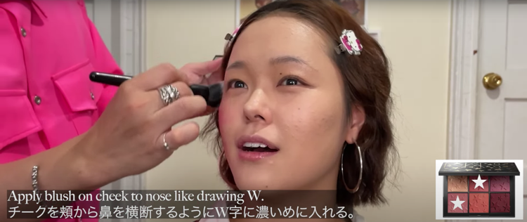 ・頰から鼻を横断するようにW字に濃いめに入れる。さらにチークを重ねて、目のきわ・目尻にしっかりと馴染むように入れる。