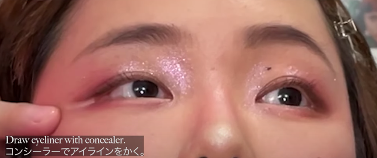 ・下まぶた目頭にポイントコンシーラーをのせる。目尻の粘膜にもポイントコンシーラーをのせる。