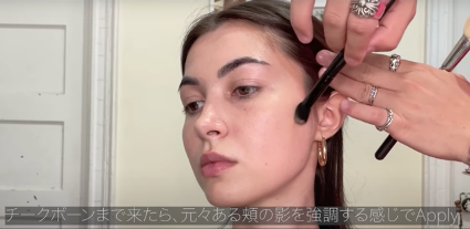 ④ ブロンザーを入れた髪の生え際のラインから頬にかけてチークを馴染ませる。ブラシに余ったチークはブロンザーを入れた箇所に重ねるように馴染ませる。ブロンザーで影をつくった上に暗めのチークを入れることによって色に高級感と深みがでる。