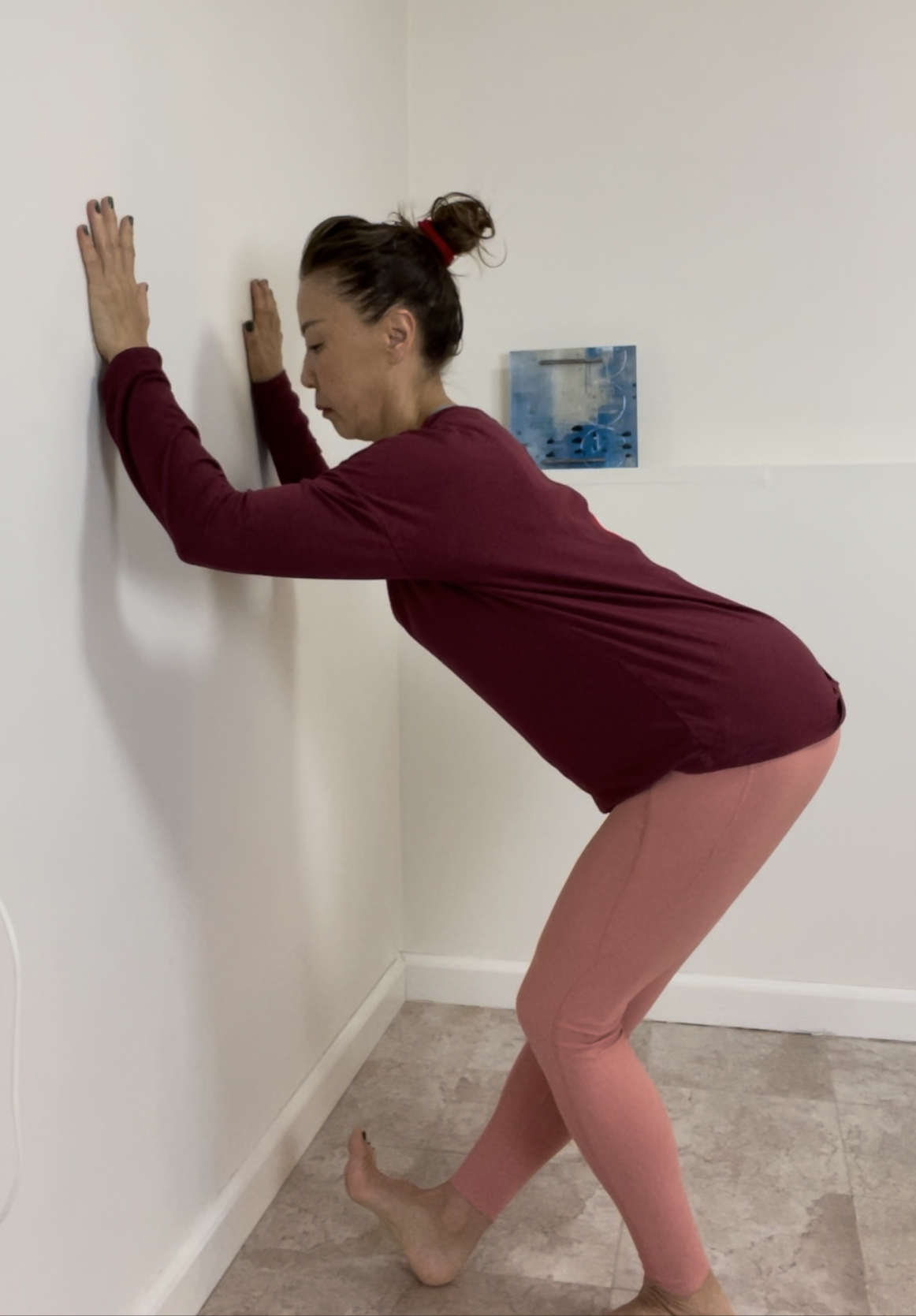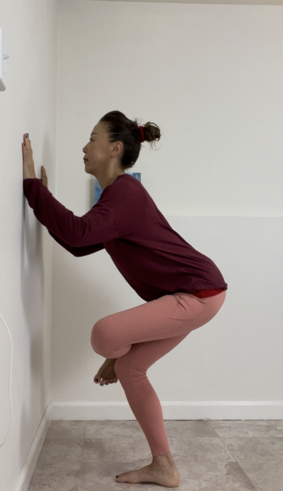 ①右足を左のモモも上に4の字で置く ②顔は壁を見たまま、左足の膝を曲げてお尻を後ろへ引く(遠くの椅子に座るように)ももが床と平行になるまでお尻は後ろへ。(ヒザが爪先より前に出ないように注意)お尻の横の伸びを感じながら60秒キープ。反対足も行う。