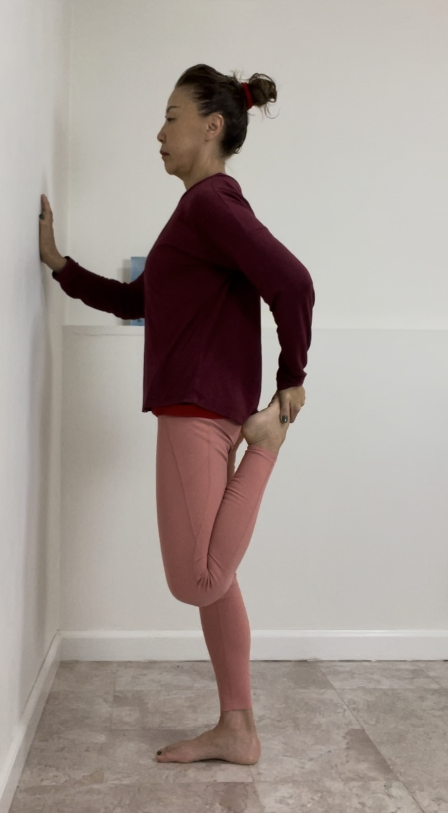 ①左手は壁に置き右手で右足の甲を持つ ②カカトをお尻につける ③おへそを背中に引き込みお腹を凹ませるように腰を丸める ④腰を丸めたまま右ひざを後ろへ5センチ動かす。ももの前、股関節の前の伸びを感じながら60秒キープ。反対足も行います。腰を反らないで腰を丸めたままで行うことがとても大事。