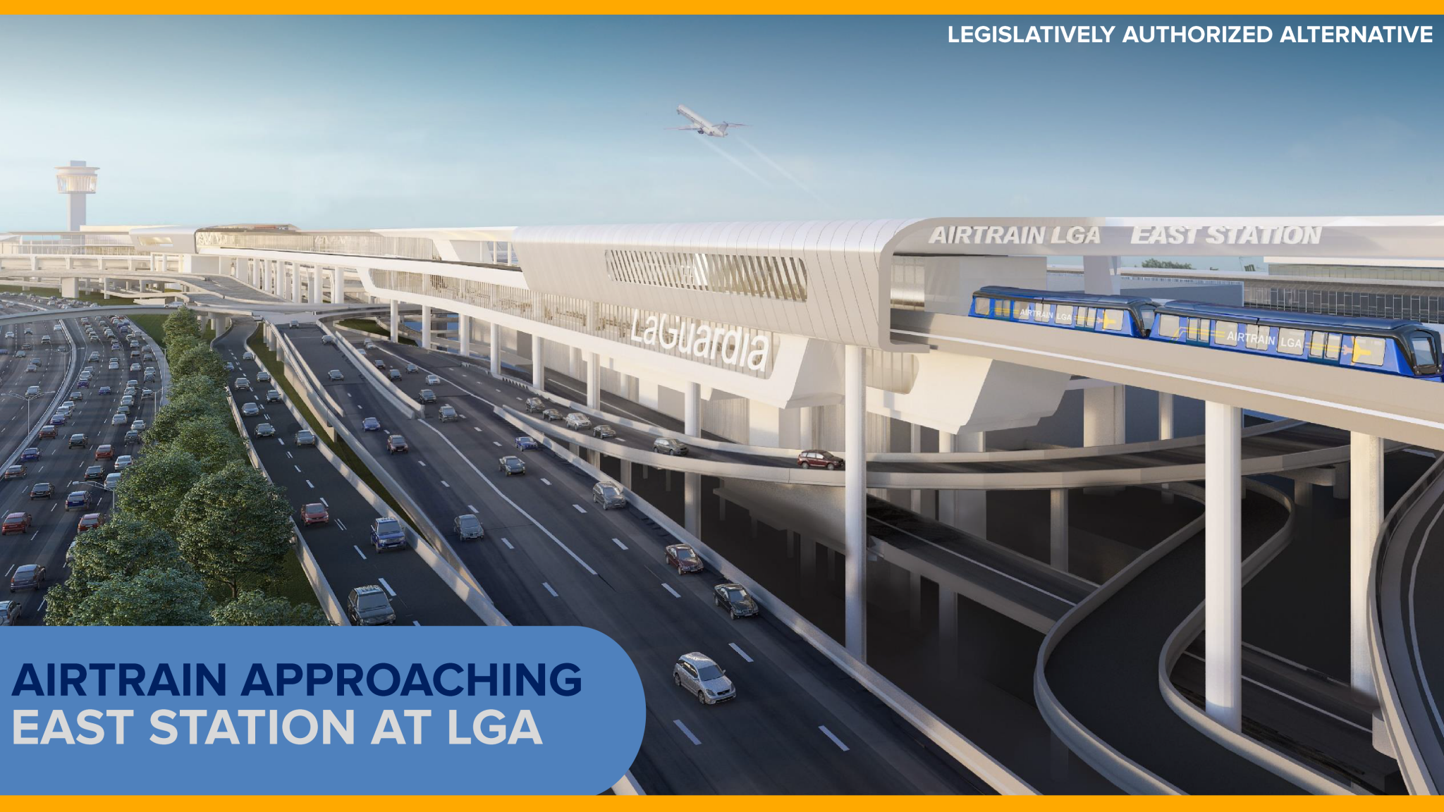 同計画はニューヨーク州のクオモ前知事の肝いりで始まったが、ホークル知事はさらなる分析が必要として、計画を中止。PAの専門家委員会は今回、エアトレインの代わりに地下鉄N線・W線のクイーンズ区アストリア−ディトマース・ブルバード駅との間にシャトルバスを運行すべきだとの結論を出した。全て電気バスにする。ホークル氏は「コスト効率のよいクリーンな結論が出たことは喜ばしい」とコメント。バスを運行することになるMTAも「無料空港リンクバスQ70の改善を含め、PAと協力する」としている。向こう5年以内にサービスが始まり、年間500万人が利用すると予想されている。