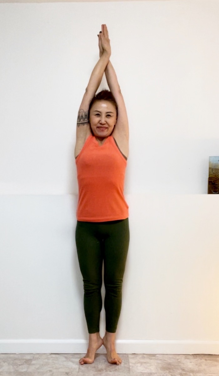 ②両手を胸の前で合わせて上にあげる(両腕は耳の横)