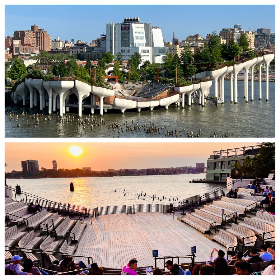 まずは、船に乗らずに辿り着ける最短距離の島、リトルアイランドをご紹介します。2014年の計画から紆余曲折とパンデミックを経て、満を持してのオープンとなったのが2021年の5月。まだ屋内ではマスク推奨、密を避ける風潮のあった頃でした。屋外の新しい、しかも陸から徒歩でアクセスできる新しい公園施設とあって、リトルアイランドは太陽の下でのびのびと過ごしたいニューヨーカー達で溢れんばかりの大人気の場所となりました。
