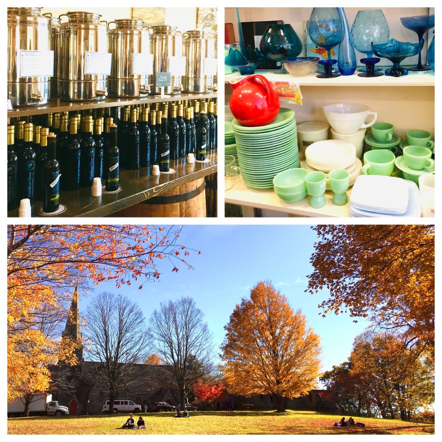 コールドスプリングはとても小さな街です。メインストリート沿いに可愛いカフェ、ファイヤーキングなどを扱うアンティークショップもあれば、珍しい味のビネガー屋を置くオリーブオイル店The Blue Olive(木~日オープン)もあり、目も舌も楽しませてもらえます。ピーチやピンクグレープフルーツビネガーはサラダやモッツァレラチーズにとても良く合いました。奥にある可愛い教会まで足を運べばほぼ終点。ちょうど日帰りの小旅行にピッタリです。紅葉時期のお天気のいい週末は、復路は特に混んでいることも考えられますので、疲れすぎる前に電車で帰路につきましょう。普段疲れた目に、電車旅で眼福のひと時を過ごしてみませんか。