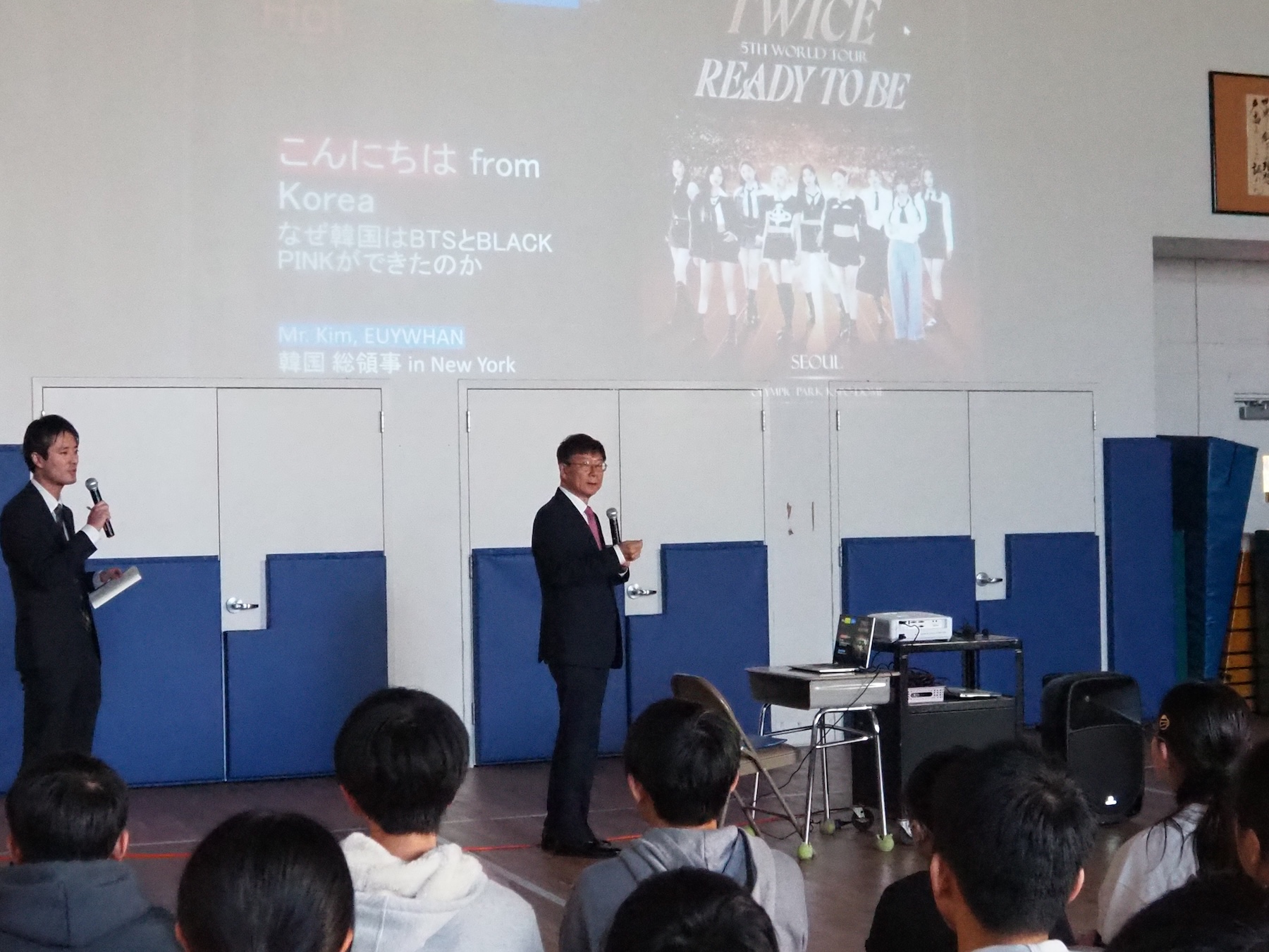 本島義輝さん (米州営業第二部)は、ニューヨーク日本人学校での在ニューヨーク韓国総領事の講演会で通訳のボランティアをした。総領事が「なぜ韓国にはBTSとBLACKPINKができたのか」という題名で中高等部の生徒約50人に英語で講演、本島さんは日本語で通訳した。