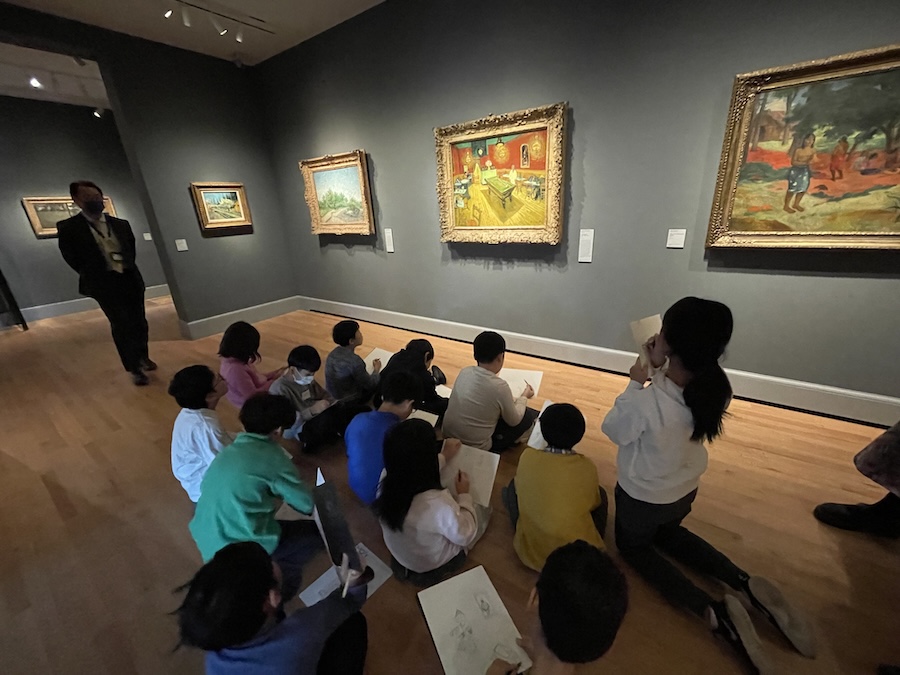 前半は、ミュージアムエデュケーターに案内してもらいながら館内をまわった。はじめに現代アートの絵画を、その後アジアの美術に関するコーナーで観音菩薩を鑑賞し、最後にゴッホの絵画をじっくり見た。それぞれの作品の気になった所や面白いと感じた所をスケッチし、エデュケーターの案内のもと、なぜそれをスケッチしたのか、それは何を表しているのか等、みんなで考えたり想像したりしながら、アート作品に親しんだ。後半には、ペアごとに館内をめぐり、自分の心がひかれた作品を見た中で、心に残った物を各々が一生懸命スケッチした。