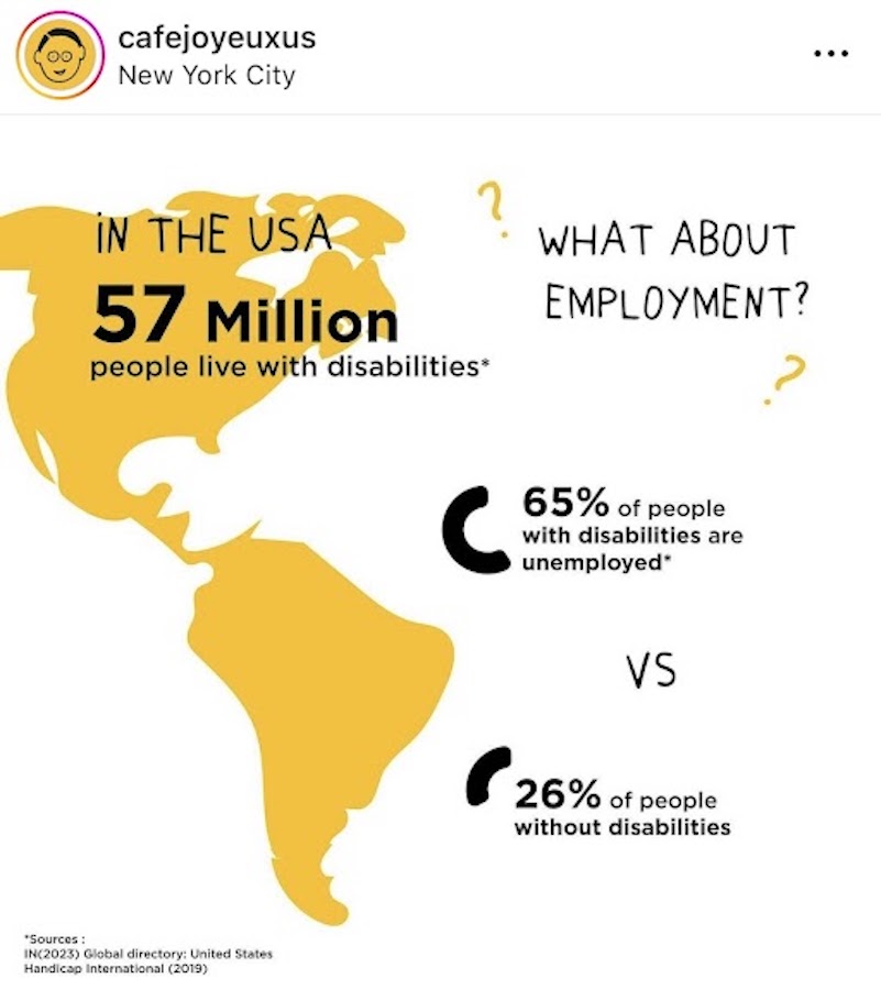アメリカで5700万の発達障がいのある人のうち65%が雇用されていない(カフェ・ジョワイユのインスタグラム(@cafejoyeuxus)よりスクリーンショット)