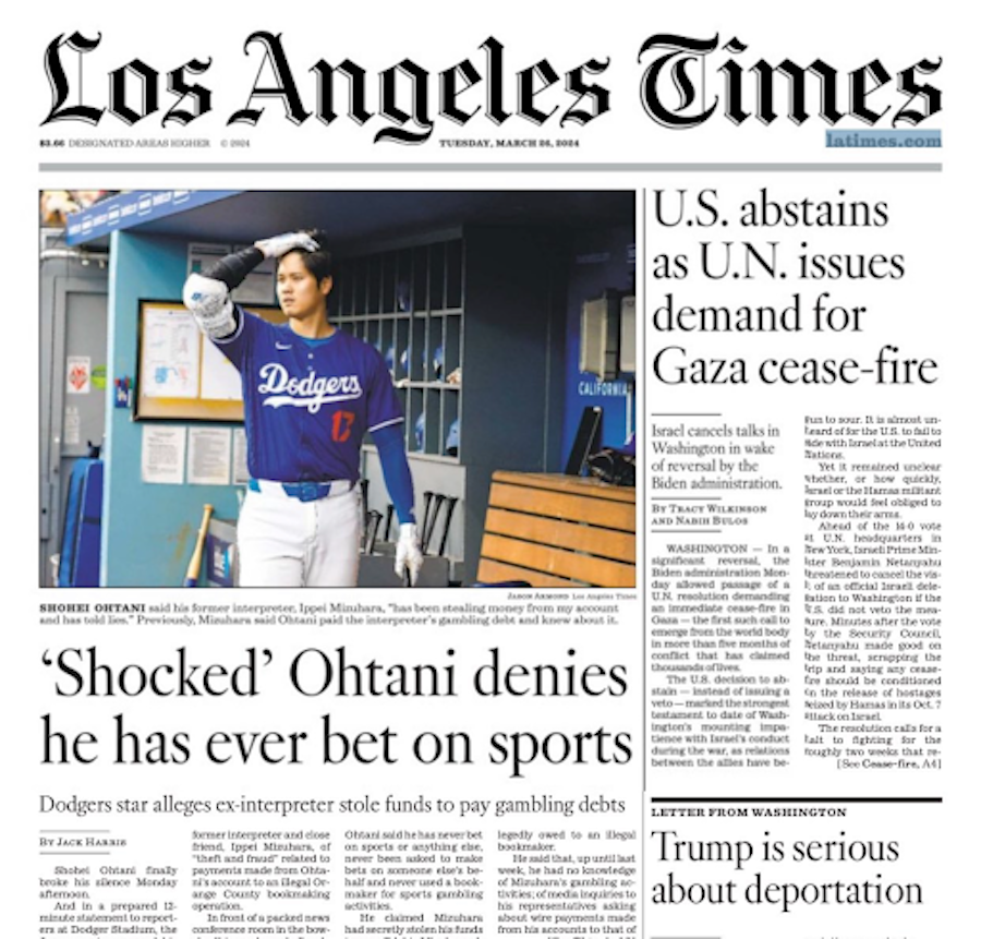 大谷の声明を伝えたLAタイムズ記事は、一面トップと、事件の震度を浮かび上がらせる