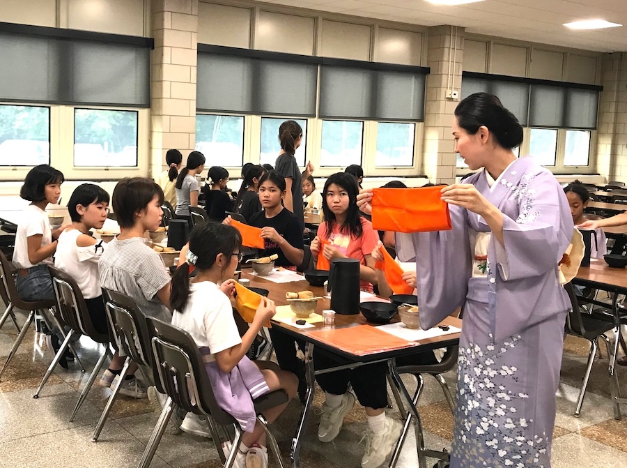 茶の湯クラブでは、和服を着た講師の手ほどきで、お茶の作法を学び、日本の伝統文化を学ぶ場となっている。おいしい和菓子とお茶をいただけることが子ども達にとって何よりも待ち遠しい機会だ。