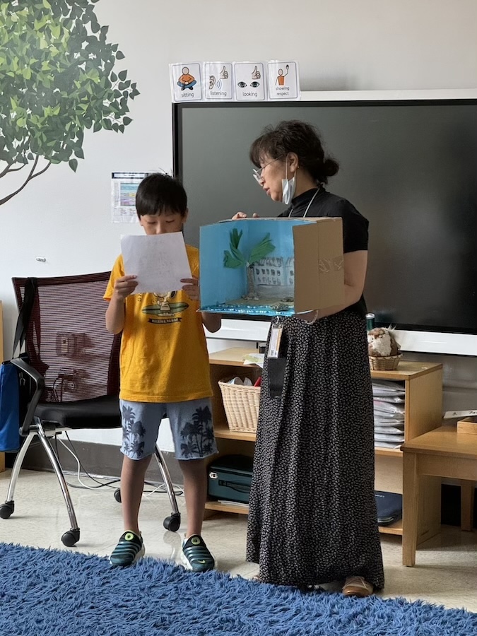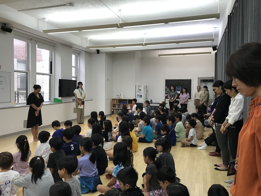 始業式では、新しい学友の紹介や新学期についての話があり、子どもたちはそれぞれ顔を輝かせて期待とやる気に満ちていた。また式後は9月11日を前に追悼の時間を設け、ディレクターが2001年に発生した同時多発テロ時のニューヨークの模様や現在も世界各地で続く紛争や戦争について語って聞かせた。その後、全員で平和への思いを胸に黙とうを捧げた。夏休みの「自由研究」が集ったこの日、各クラスで発表会も開催。14日には校内に全作品を展示、小学部高学年(3~6年)と中学部ではそれぞれ代表者による自由研究の発表も行なった。