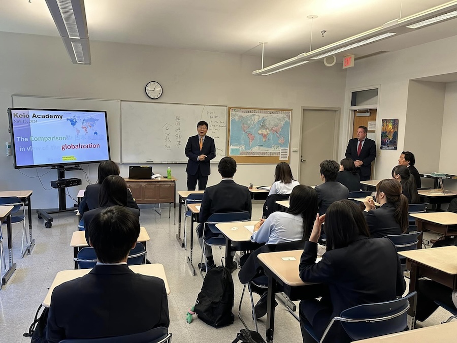 Chatting with him, I was deeply impressed with the consul general’s deep knowledge of Fukuzawa Yukichi sensei, whose major work An Encouragement of Learning Mr.Kim read very closely. Since Keio Academy of New York, established in 1990, has proudly advocated the “Japan-U.S. Keio” tri-cultural ethos in its mission statement revised in 2022, we were thrilled to welcome him to our campus on November 13th, where he delivered an exciting lecture on the thoughts of Fukuzawa sensei in the context of globalization. As a result, Mr. Kim brilliantly captured our students’ imagination by emphasizing a couple of stimulating principles: “Leaders should be readers” and “Learn and win.”