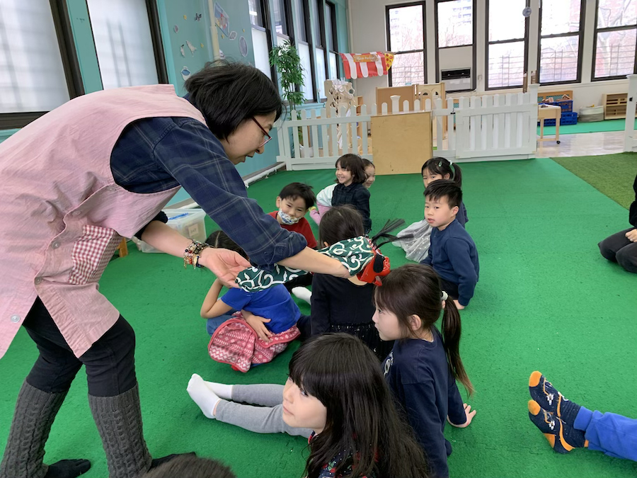 幼児部では「お正月の集い」を開催。日本の正月は、幸福をもたらす年神様(としがみさま)を家族全員で迎え、新しい年の始まりを祝うもので、しめ縄、門松、鏡餅などを飾ったり、おせち料理を食べたりして過ごす。子どもたちは正月についての説明を聞いた後、「お雑煮を食べた」「鏡餅を飾った」など、それぞれの家庭での出来事を報告し合い、正月についての紙芝居で学びを深めた。こまや羽付きなどの正月の遊びを体験し、頭を噛んでもらうと邪気払いや疫病退散のご利益があるという獅子舞に「ガブリ」とされ、今年1年の健康と成長を祈った。