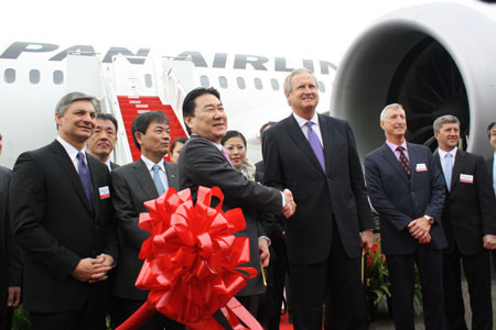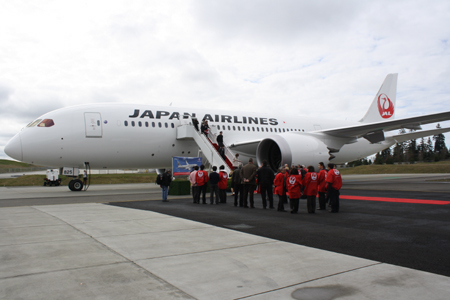 日本航空(JAL)は26日、ワシントン州エバレットのボーイング工場で、最新鋭中型ジェット旅客機787「ドリームライナー」2機を受領した。同日、日航はボーイングとGE・アビエーションの代表及び関係者を招き記念式典を開催、その後、1号機は成田空港へ向けて飛び立った。