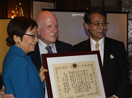 表彰状を手に笑顔を見せる(左から)松木史氏、マーク・ハンデルマン氏、廣木重之総領事=19日、大使公邸(photo:Mizunuma)