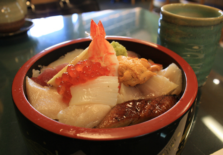 おすすめは何といってもサムさんとっておきの「おまかせちらし寿司」。その日に入った新鮮なネタをふんだんに使った豪華な盛り合わせで、満足の一品だ。