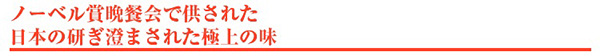 ノーベル賞授賞式後に催された華やかな晩餐会の会場に、メイド・イン・ジャパンの「サケ」の姿があった。半世紀にわたり培われた鋭い感覚と確かな舌で日本の高い食文化を世界に紹介し続けてきたJFC International, Inc. が薦める─その名も純米吟醸「福寿」だ。