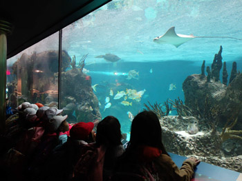 ニューヨーク水族館を訪れた小学部低学年の子どもたち。「エイがこっちに寄って来るよ。笑っているみたいだね」