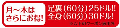 チャイナタウンのなかでマッサージに行くなら“スゴ腕”が揃う同店へ。通常料金でも全身(60分)40ドル、足裏(60分)30ドル、全身(30分)+足裏(30分)40ドルと、マッサージが格安で受けられる。オーナーをはじめ、20年以上の経験と熟練した技をもつマッサージ師が勢ぞろい。指のはらや先端をつかい、足裏のつぼを数ミリずつずらして押すことで、マッサージ後は体全体がときほぐされる。体験した人だけがわかるその効果は絶大だ。肩のこり、疲労感、むくみ、寝違え、冷えを解消するにも効果的。このホリデーは自分に癒しのご褒美をあげてみては。