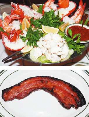 オーセンティックなステーキハウスなだけあり、シーフードプラッターやウルフギャングサラダは見た目も美しく、豪華な一品。シズリングベーコンは豪快にジューシーさを楽しめる。いよいよ「ポーターハウス・ステーキ」がジュージューと音を立て運ばれてくる。表面がバターでカリッと焼き上げられた肉を頬張ると、中はしっとりとちょうど良いミディアムレアの肉で、しっかりとした食感が楽しめる。Tボーンの骨を境に片側はフィレ、もう片側はサーロインで、Tボーンよりひれ肉の割合が多い最高級部位がポーターハウス・ステーキと呼ばれる。これ以上にステーキを堪能できる部位はないであろうし、これまで食べてきたステーキの概念がくつがえる。