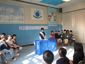 10日には、3年生以上の児童全員が参加し、各候補の立会演説会と投票が行なわれた。演説会では、一人ひとりの候補が学校に対する自分の思いを話した。
