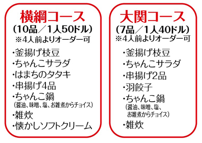 新しい年の景気付けには、ニューヨークで食べる“東京両国の下町ちゃんこ”がもってこい。野菜や肉がたっぷり入ったヘルシーでボリューム満点のちゃんこを囲んで、忘・新年会を盛り上げよう! また、1月限定で「お雑煮ちゃんこ」も登場。幹事もよろこぶ大満足の宴会メニューをお試しあれ。