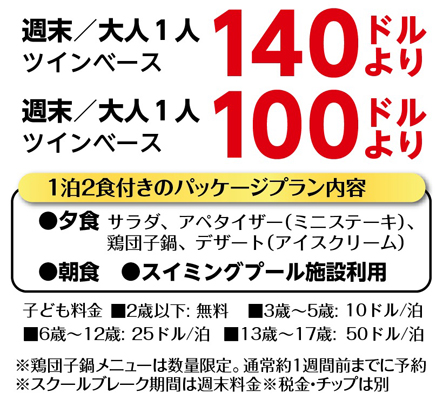 キャッツキルにあるチャレンジングなゴルフコースとしても知られるゴルフリゾート。冬はゴルフの代わりにスキー、スノーボードなど、近郊のスキー場でウィンタースポーツを満喫できる。その後は温水プール、サウナ、屋外ジャクジーでリラックス。さらにこの冬の夕食は、みんなで囲める鶏団子鍋も(要事前予約)。今なら「年末年始スペシャルプラン」がお得。31日は、米国流のカウントダウンパーティ(ビュッフェ)、元日はボリュームたっぷりのおせち料理も加わったニューイヤーズビュッフェで、楽しさ倍増。日本人スタッフまで気軽に問い合わせを。