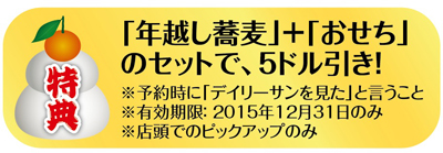 こだわりの手打ち蕎麦や豊富な一品料理を提供する同店では、ことしも大晦日限定の「年越しそば(16ドル)」を提供する。店内でも食せるほか、持ち帰り用(2人前20ドル/4人前30ドル)も用意している。さらに「おせち料理(2人前30ドル)」も30日まで予約受付中。黒豆、えび、自家製黒豚チャーシューなど10数種類以上が入ってこの値段と、毎年好評でリピーターも多い。また、今季は日本で話題の「すだちそば(15ドル/ディナーのみ)」が登場。すだちを丸ごと1つ極薄にスライスしたユニークなそばは、究極にシンプルなおいしさを醸し出す。年末年始に冬季限定のすだちそばを、ぜひ堪能しみては。