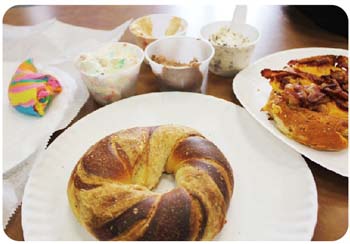 そして、The Bagel Storeを有名にしたもう1つの商品が、「レインボーベーグル(3・95ドル)」というカラフルでポップなレインボーカラーで練り合わされた、見た目も香りも楽しいベーグル。このオールシーズンで展開しているレインボーベーグルのほかに、バレンタインデーのベーグルなどのシーズナルなカラフルベーグルも作っている。