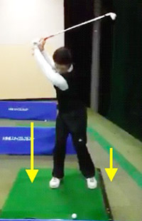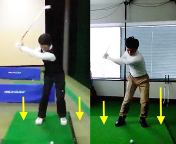 図3の比較写真では、2人とも腕が同じ位置にきた時、左の人は両足の体重配分が均等なのに対し、右の人は、左足に体重移動をし過ぎているのが分かります。左の人は、体の横ブレが小さくなったことにより踏み込んだ後の運動連鎖が適切に行われ、体の回転スピードが上ります。そのままダウンスイングで左足に少しでも体重を乗せてスイングすると、クラブヘッドの軌道はドローヒッター特有のインサイドアウトというものになります。これがきちんとできたら、ボールがスライスして距離を落としてしまうという可能性も低くなるわけです。