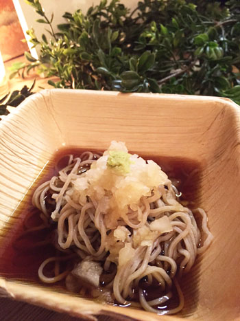 「安全でおいしく、リーズナブルな料理を提供したい」というコンセプトのもと、懐石料理をベースにさまざまなアレンジを取り入れた料理を提供する同店。当日は、「蕎麦豆腐」「合鴨ロー酢」「お好み焼き」など、キタノホテルの白梅などで経験を積んだシェフ、喜多充さんが腕を振るう料理10品以上が、集まった関係者に振る舞われた。