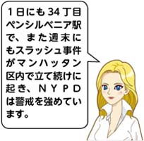 20歳の女は当初、3月31日午後5時過ぎ、頭にスカーフを巻いてレクターストリートに近いブロードウェー65番地の前の歩道を歩いていたところ、見知らぬ男が近づき、女に向かって「テロリスト」と罵った後、いきなり顔面を切りつけ逃走したと警察に話していた。女の左側の顔面には、長さ2インチ(約5センチ)の切り傷があり、駆けつけた救急医療班によりその場で手当てを受けた。