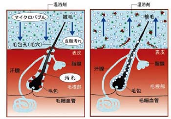 同マシンで作るマイクロバブルと酵素が配合されたオリジナルクリーナーを使用することで、頭皮や毛髪から汚れを浮かせ隙間を作り、毛髪や皮膚の表面についたほこりや汚れはもちろんのこと、毛穴の入り口に詰まった汚れや毛穴の奥にある臭い、かゆみの原因を取り除くことができるという。さらに、薄毛に悩む人の育毛剤・養毛剤の浸透を助ける大きな効果が期待できる。