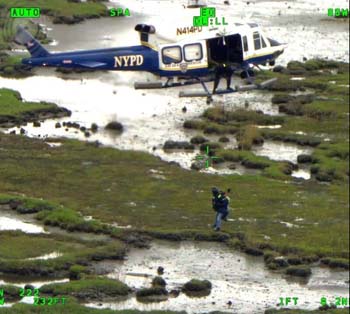 NYPDの報告によると、ヘリコプターで同湾上空を巡視中の午後2時40分ごろ、湾内のキャナージー・ポル島に座礁した小型船と、その横にいる男女を発見。別のヘリコプターが救出し、航空基地まで搬送した。2人は、50歳女性と52歳男性の夫婦で、けがもなく命に別状はないという。