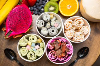 今回は、人気のフレーバー「ユニーク・ドラゴン」をオーダー。ヨーグルト味のアイスと、カットしたドラゴンフルーツをマイナス25〜30度に冷やした鉄板の上に広げ、2つのヘラでリズミカルに叩きながら混ぜていく。今度はそれを鉄板に薄く伸ばし、適当な幅に切り分けたら、端からくるくると丸め、盛り付けて完成。この間約3分。スタッフの鮮やかな手つきはまるでマジックショーのようで、思わず見入ってしまう。