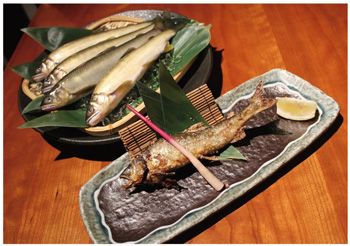 高品質な食材が自慢の同店では、夏季限定で和歌山県産・築地直送の「あゆの塩焼き(12ドル)」を提供中、パリパリの皮とふんわりした白身に、ちょうど良い塩梅の塩加減。ペアリングなら、今月一押しのお酒、「純米大吟醸酒しずく酒(ボトル175ドル、小カラフェ70ドル)」がぴったり。そのほかにも、海鮮も含めさまざまな旬の味が存分に楽しめる。