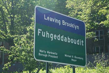 辞書よりも早く、このフレーズに目を付けたブルックリンのマーティー・マーコウィッツ前区長は、同区を離れる際の「さようなら」のあいさつにfuhgeddabouditを使うことを提案し、既に同区の出入り口となる橋などの標識にこれを表示させている。区のブランディングとともに、ブルックリンというスペシャルなエリアに来たことを実感できる粋な演出だ。